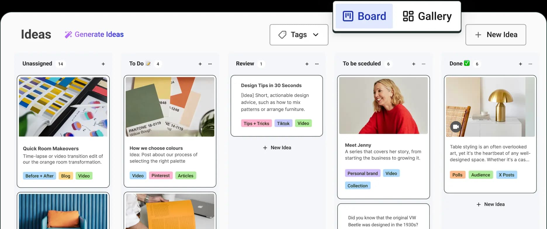 Keep your creativity flowing with an organized content backlog. Tag posts by theme, categorize ideas, and see everything at a glance so you can stay on top of your content planning without the clutter.