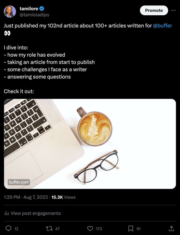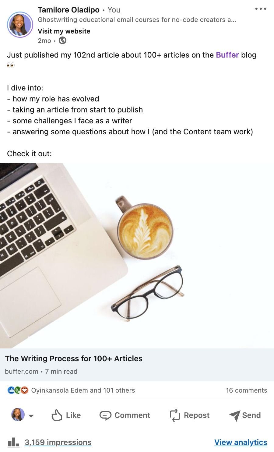 My creative strength is writing, so my main distribution channels are Twitter, LinkedIn, and any other text-based social media. When I’m creating content, I first build out the long-form version of my content. Sometimes, that can go on LinkedIn (and now, with its long-form option, Twitter).