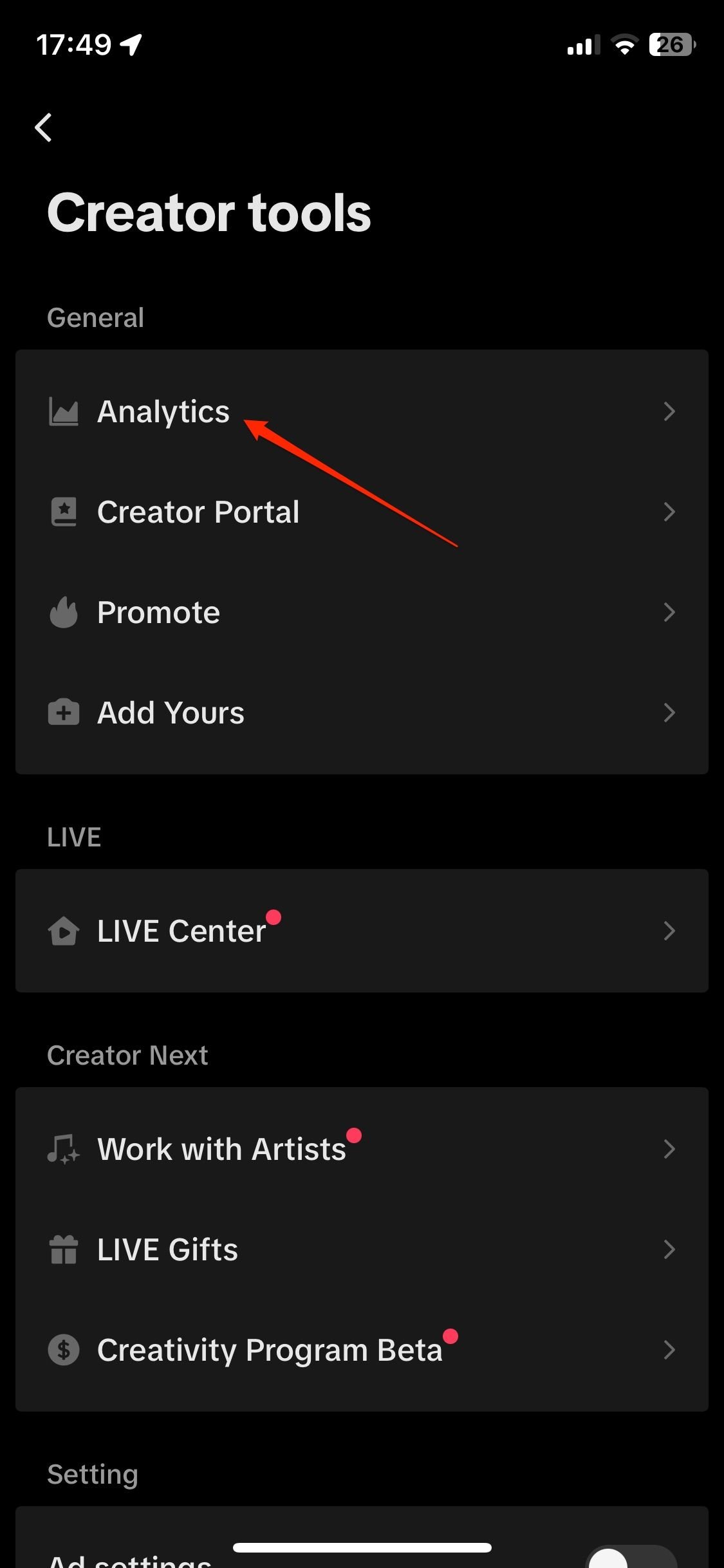 Click the icon in the top right corner, click Creator Tools, then select “Analytics.”