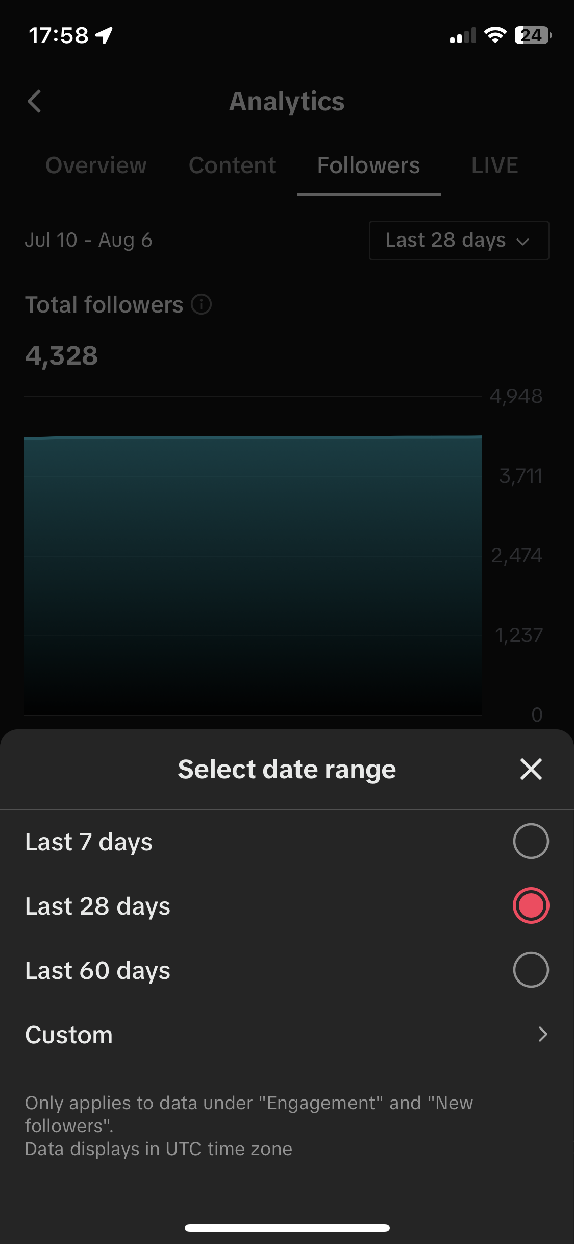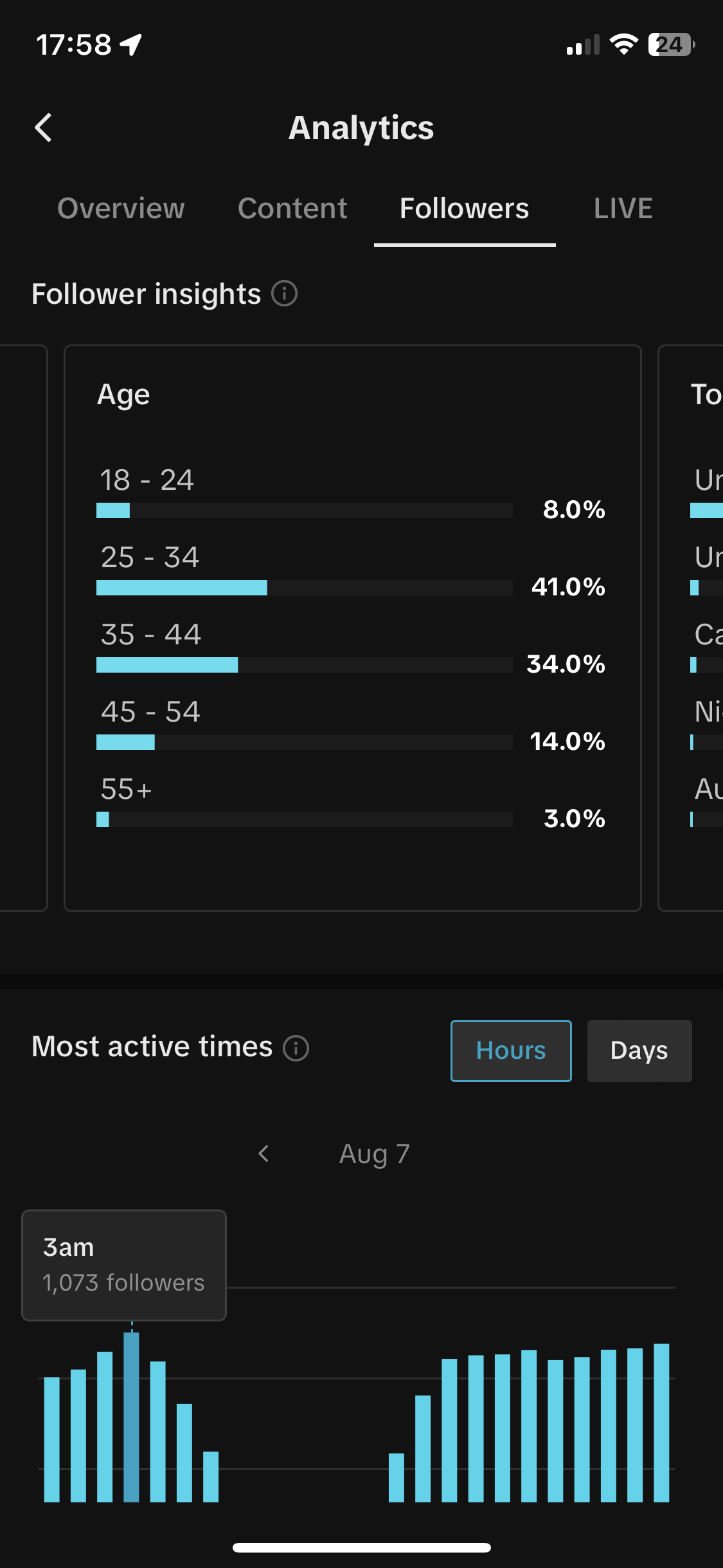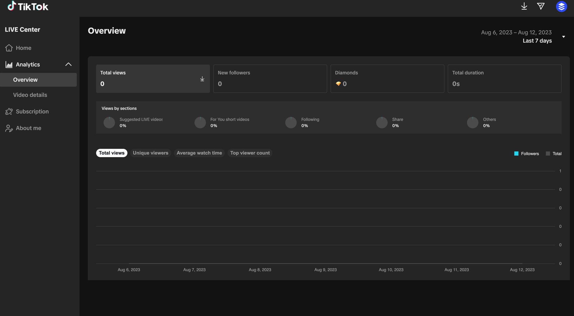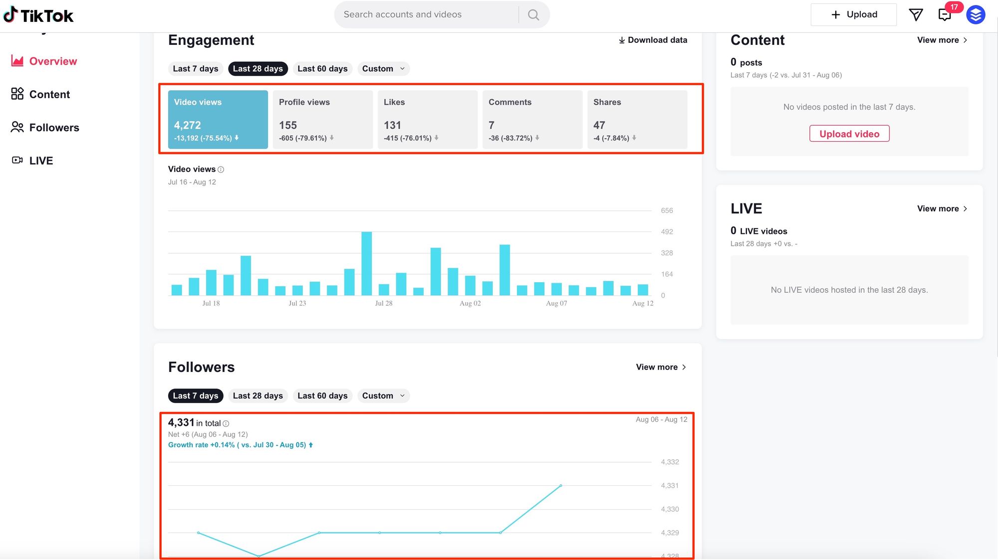 You’ll see a different overview depending on whether you have a Creator or a Business account and whether you’re logged into your TikTok account on mobile or desktop. However, the information is fundamentally the same. Within your analytics, you'll typically see four sections: Overview, Content, Followers, and LIVE.