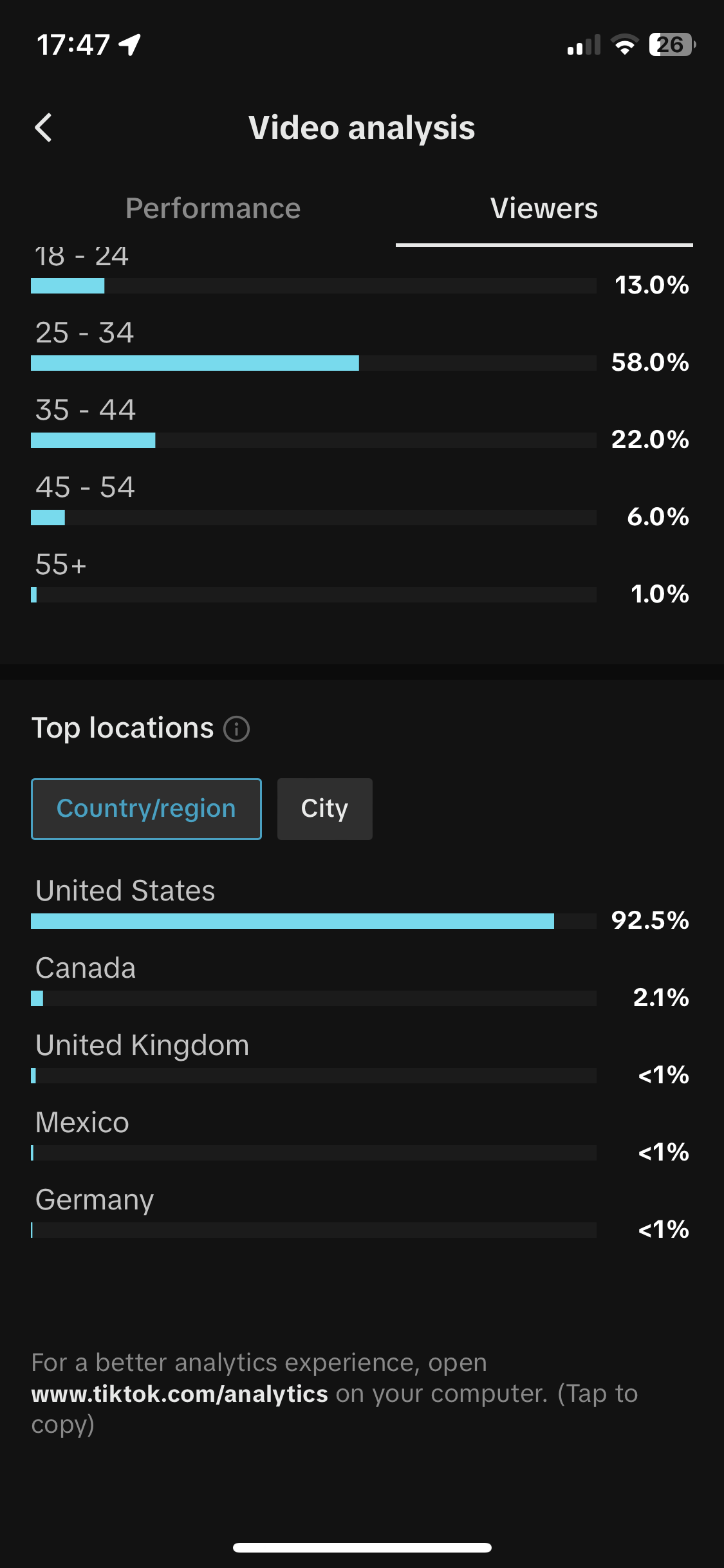 - Top countries and cities: This section highlights the top five countries and cities your followers are in.