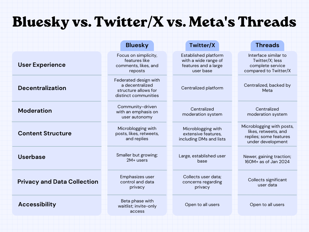 Bluesky vs. Twitter/X vs. Threads feature comparison