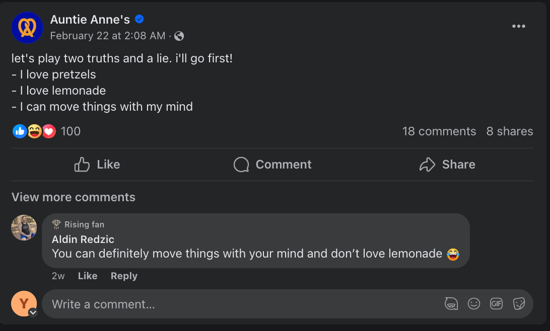 Food brand Auntie Anne’s is my favorite when it comes to creating phone-first Facebook posts.