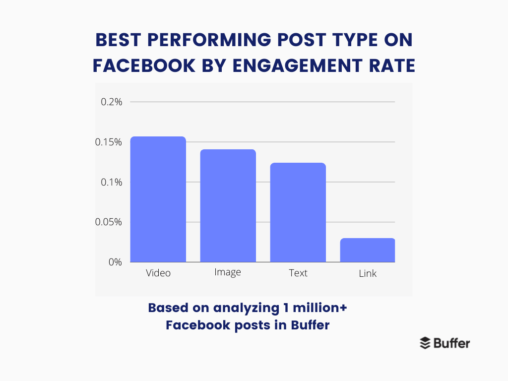 Our analysis of millions of posts showed the best content for Facebook is video. While images are amazing, video is the one getting the most engagement.