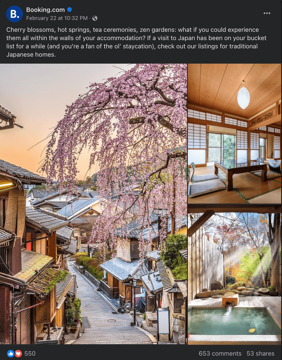 Booking.com aces their photo game — they share eye-catching real-life photos from their listings.