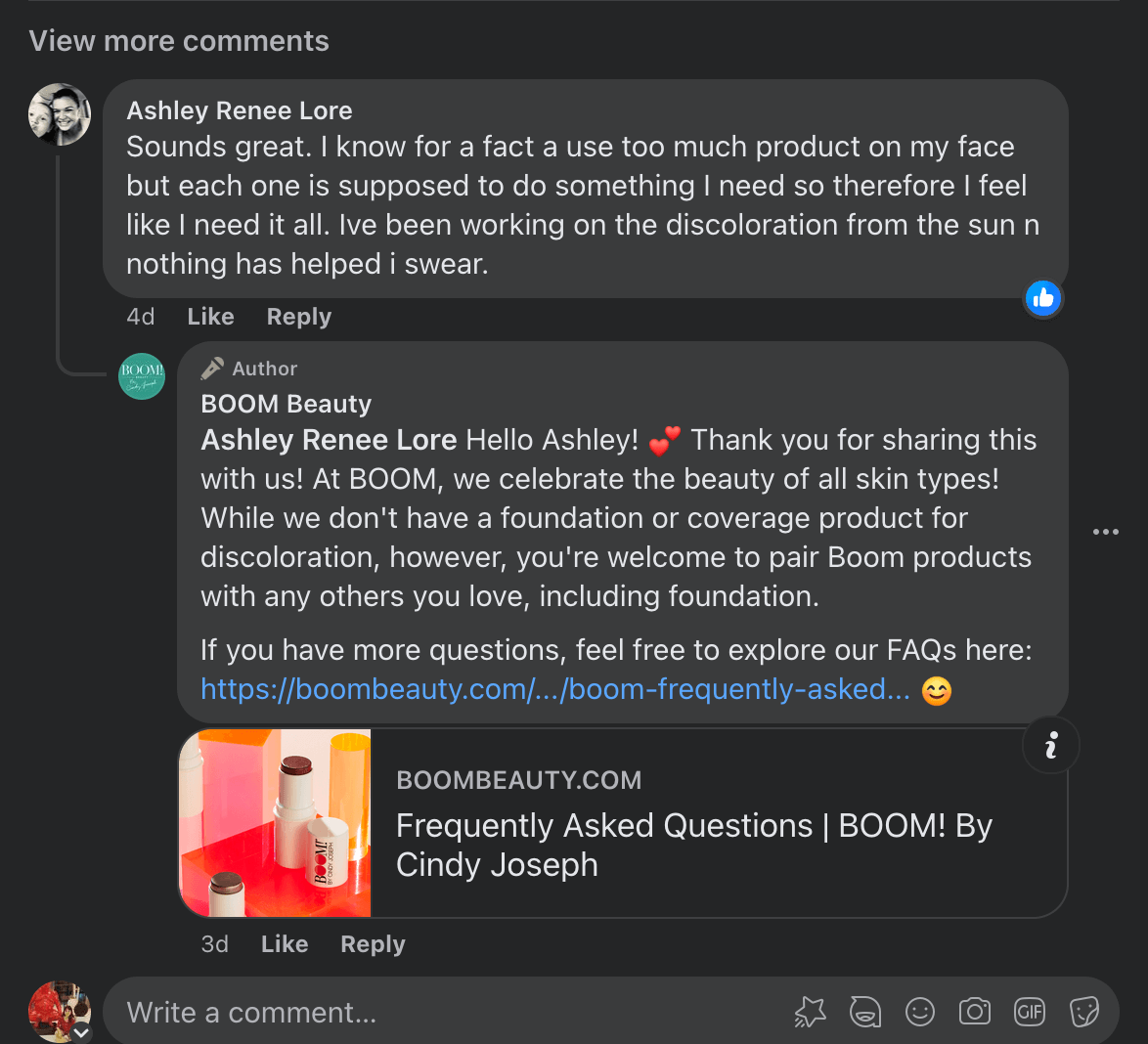 BOOM Beauty is an excellent example. They share a detailed response to their followers’ queries and react (with a heart/link/emoji) to other complimentary comments.