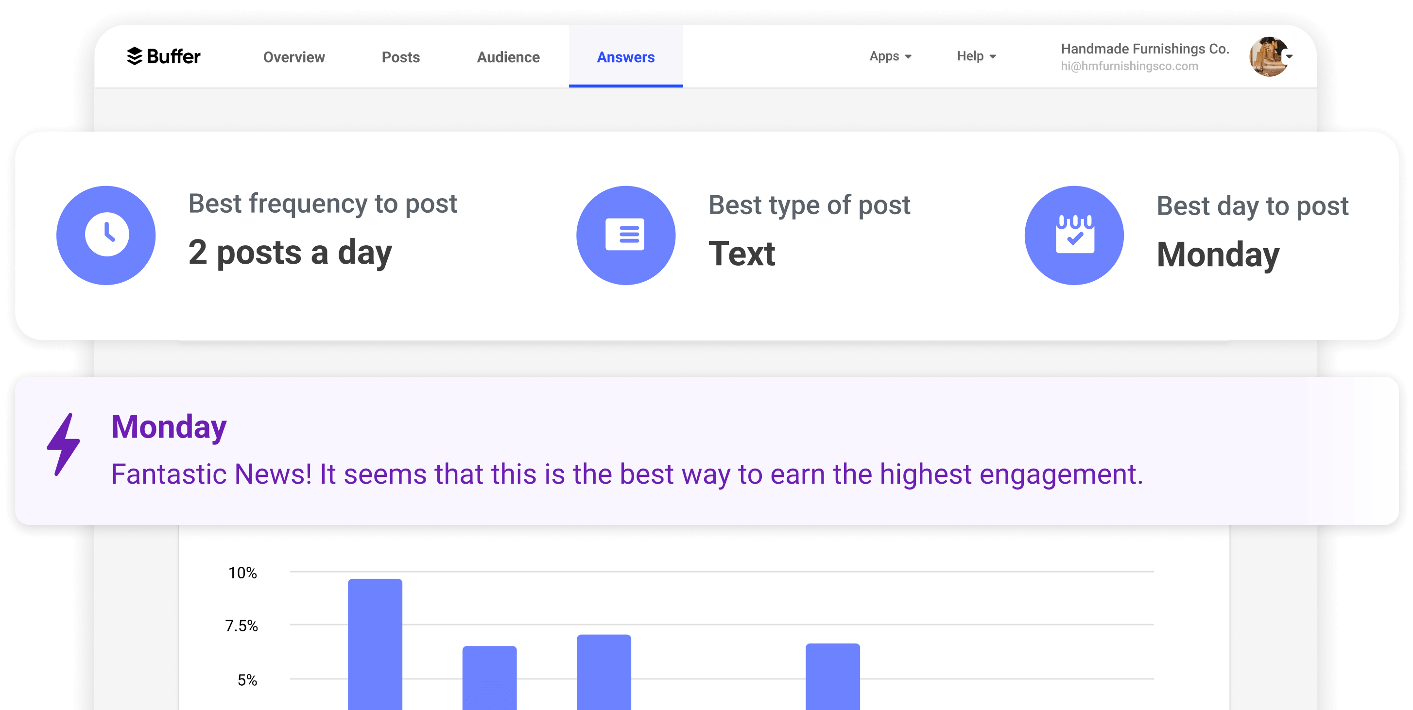 The best part? Buffer can help you with that, too! It’ll give you answers like: What is my best time to post on Facebook to get the most engagement? Which type of posts perform the best for me? How often should I post on Facebook to get the maximum return on investment (ROI)? All of the insights are tailored to you. And all of this for free!