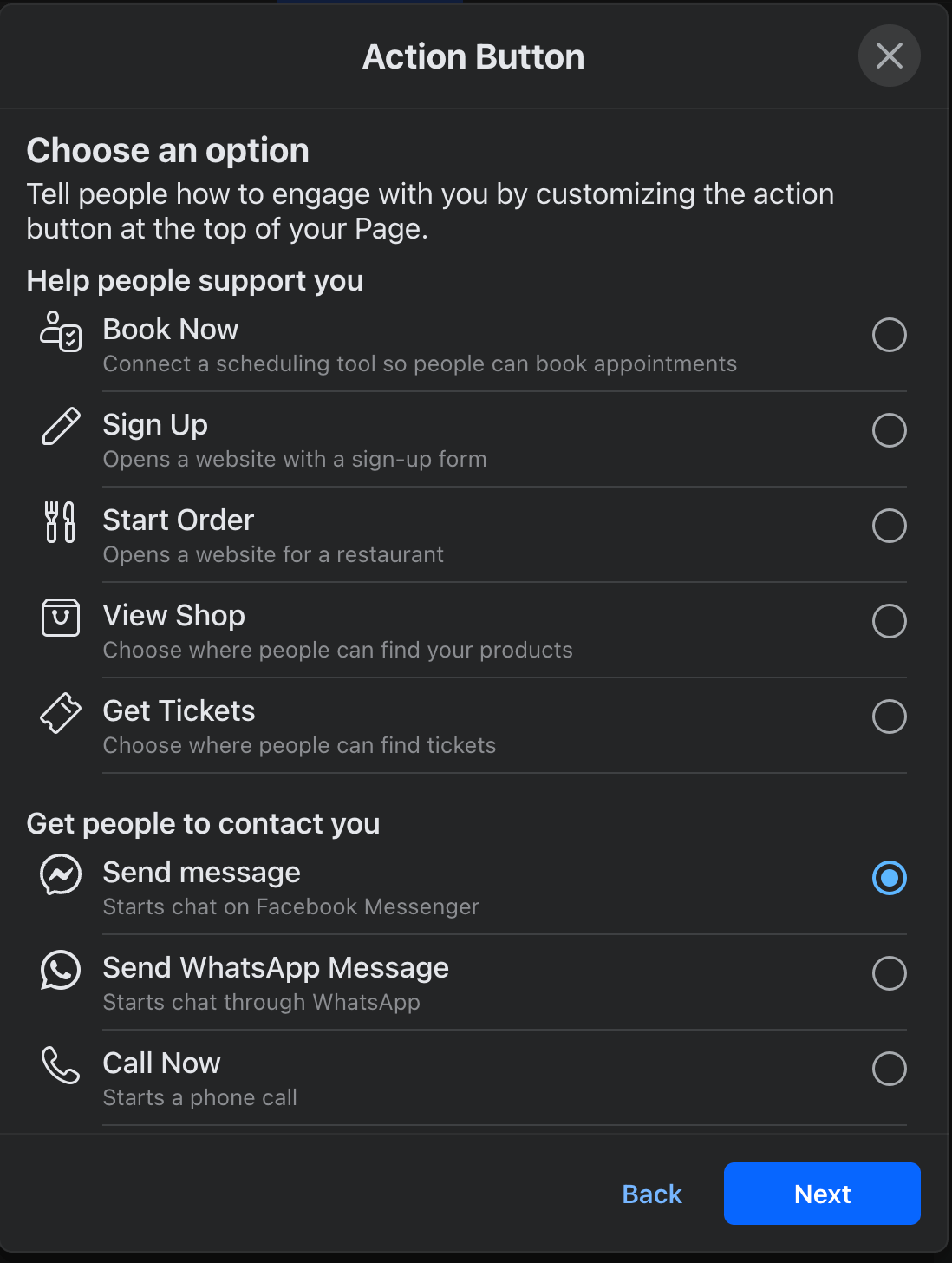 Having an overarching suggested action is great for new visitors to your page. They’ll instantly be redirected to Messenger, WhatsApp, or your website to learn more about you.