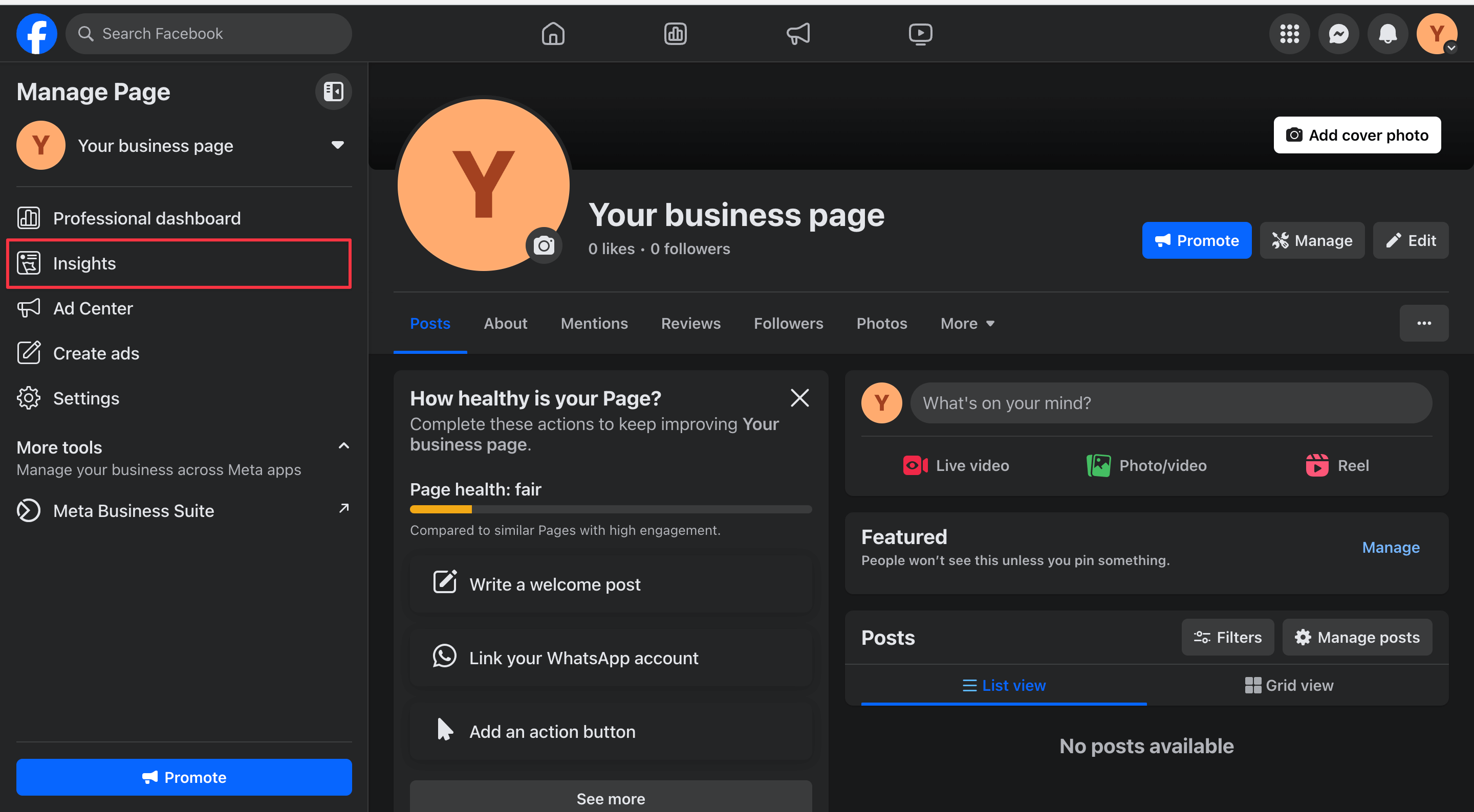 But this is for one post. Facebook shares the engagement rate for your whole page in Facebook page Insights. You can find the button on the left-hand side of your Facebook page.