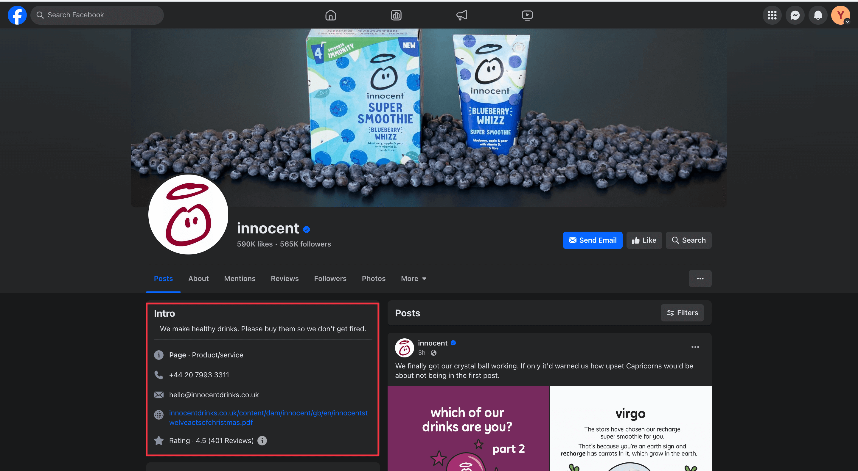 Why? This section is your chance to make a first impression on potential followers. If you do it right, you can attract new audiences and start building your community. Take the drink company, Innocent. Their about section is short, succinct, and full of their brand’s unique voice.