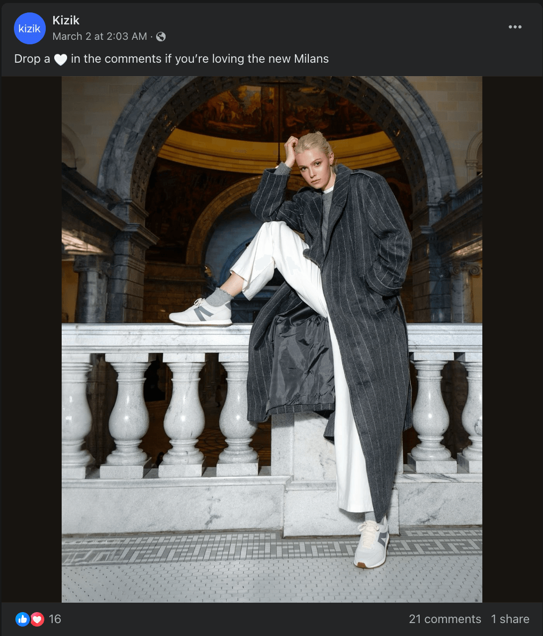 Shoe brand Kizik did a simple post by dropping a white heart emoji in the comments to encourage their followers to start interacting with the post.