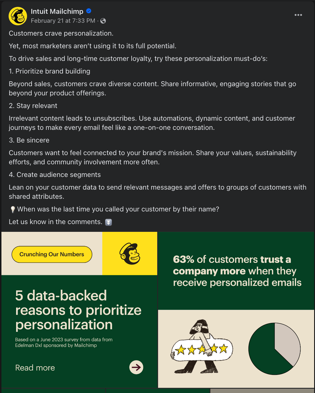 For example, Mailchimp repurposed a survey into a Facebook post and then cross-posted the carousel on LinkedIn, too.