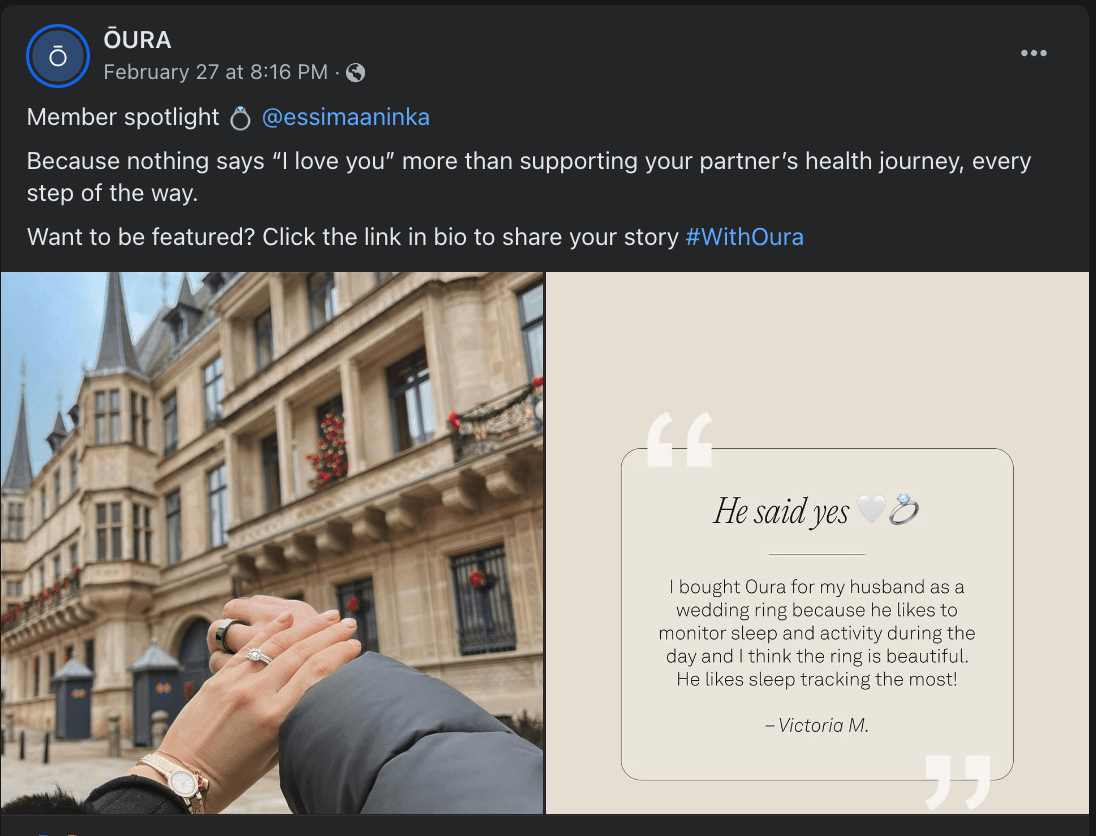 Sleep company Oura is a good example of how to feature customer stories on your Facebook page.