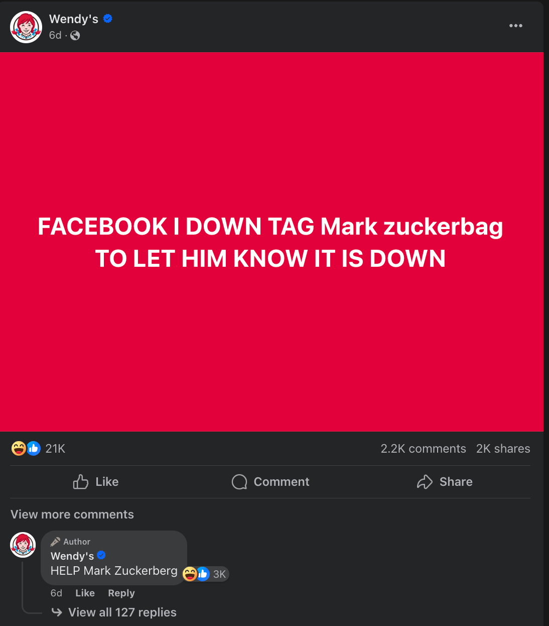 Wendy’s Facebook page excels at posting time-sensitive content (mostly memes). For example, their first post after Meta went down for a while was related to the topic.