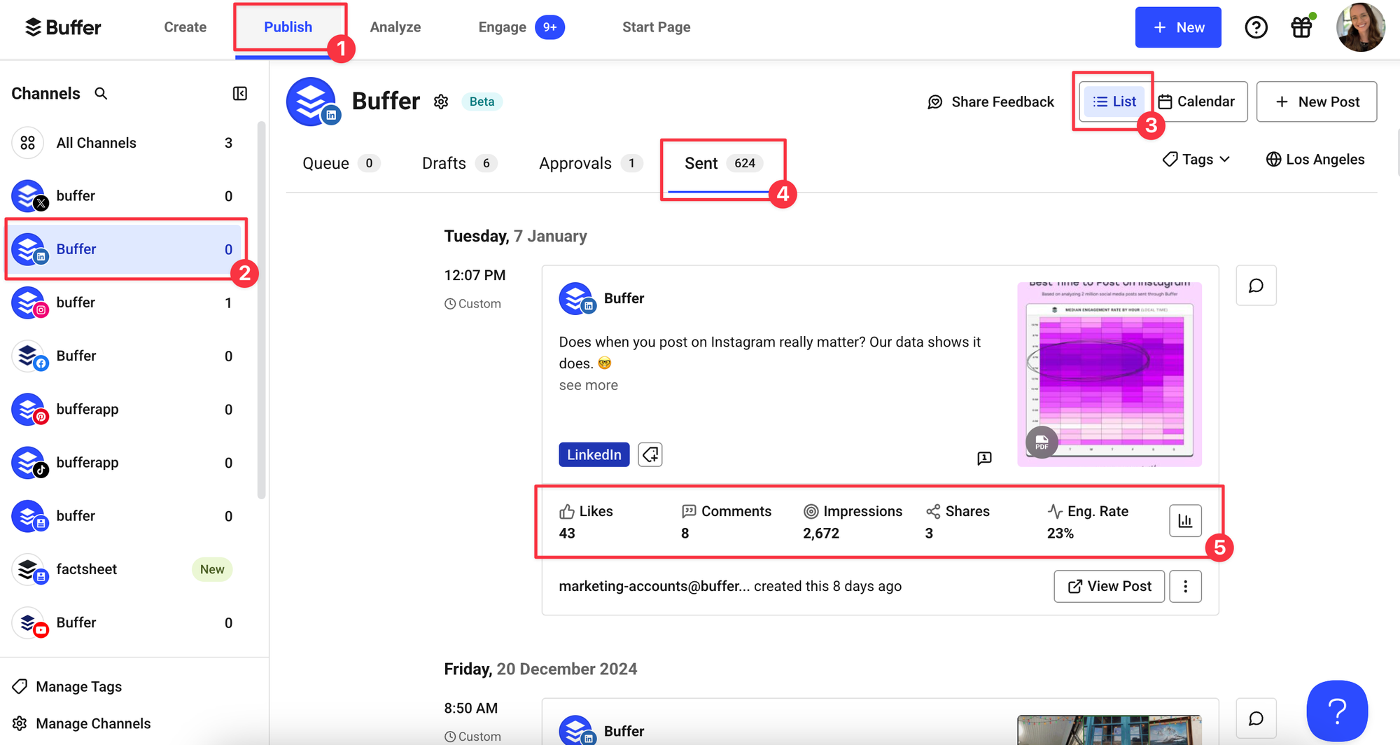Through Buffer’s Analytics, you can see an overview of what day, type of post, and frequency is best for each of your connected channels. Here’s how to access yours: