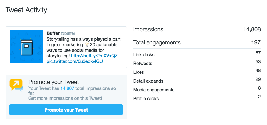 High tweet engagement doesn't always mean that you've created a successful tweet. If you get 100 likes but no link clicks, for example, then your tweet performed well but didn't really add a lot of value to your business. You can get deeper into Twitter engagements by noticing what specific types of engagements took place.