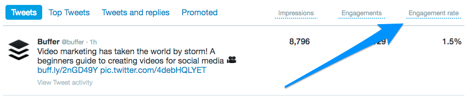How to find this data: Visit the tweet activity dashboard, and look in the far-right column in the table of tweets. Engagement rate is listed after Twitter Impressions and Engagements.