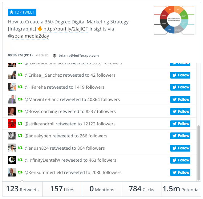 For instance, in the example below, we owe a huge thanks to all who retweeted, and we can see that a few people made a big impression.