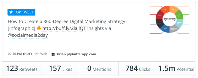 How to find this data: In your Buffer’s Analytics tab > Posts, you can view the potential reach of your post. We calculate that by adding your followers and the followers of those who retweeted you.