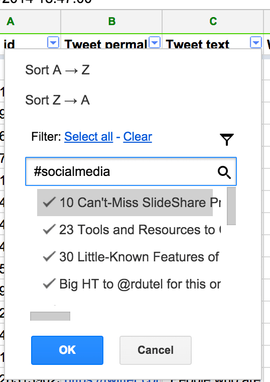Pro tip: You can remove all of the @-replies from the spreadsheet by sorting the “tweet text” column alphabetically and deleting the rows that begin with an @ symbol.