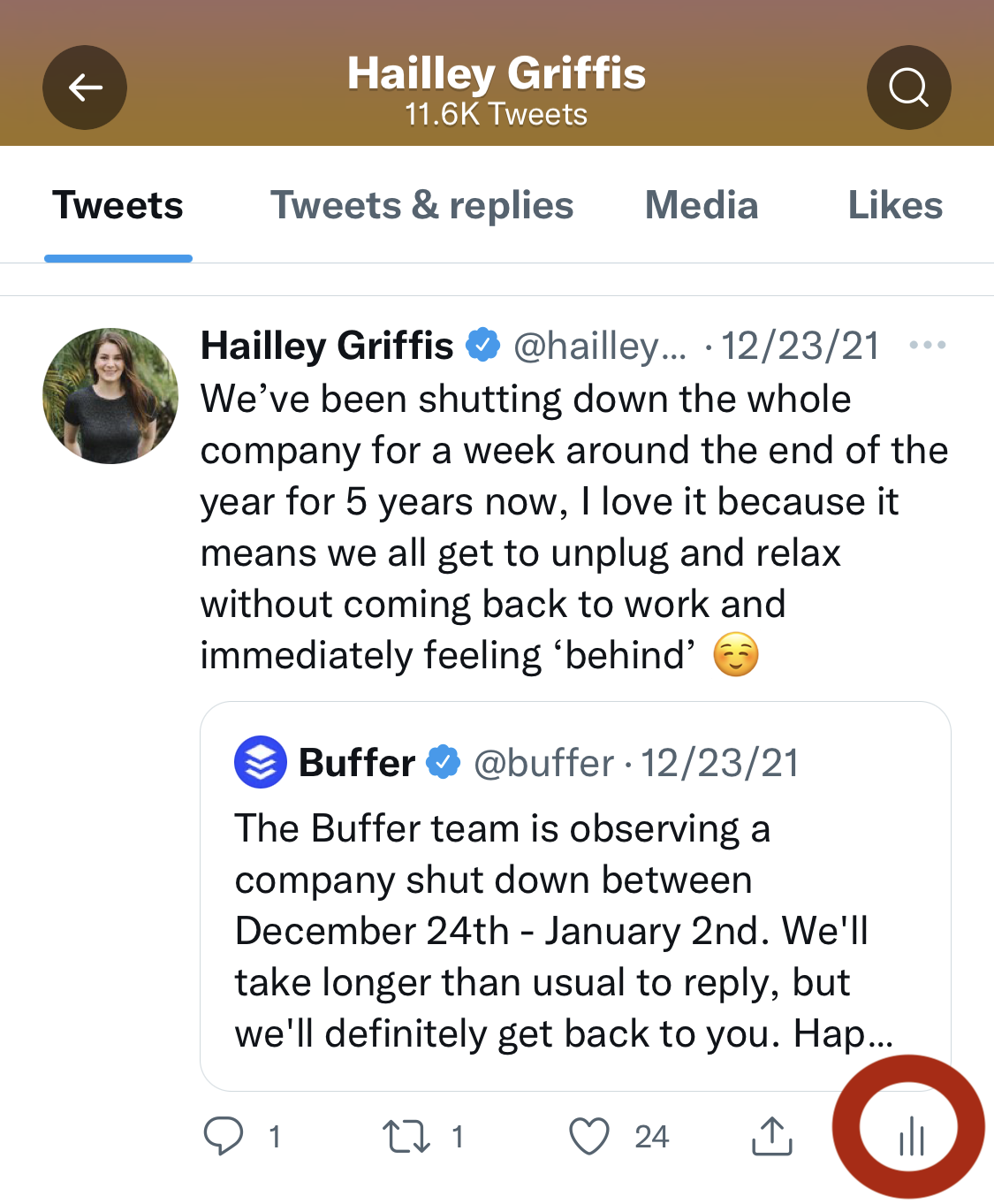 Outside of your Twitter Analytics dashboard, you can also get this breakdown by clicking on the bar chart icon on the tweet you are interested in.
