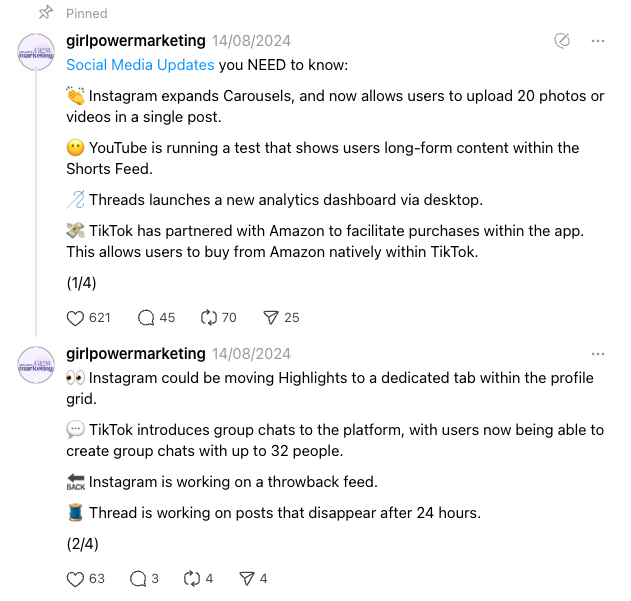 Here’s a great example of Girl Power Marketing’s weekly social media round-up. Notice how she makes it super easy to digest with short, snappy sentences and emojis as bullet points.