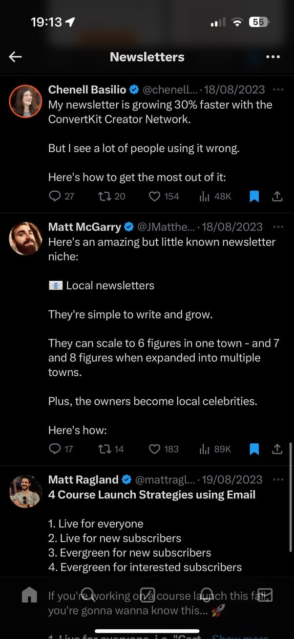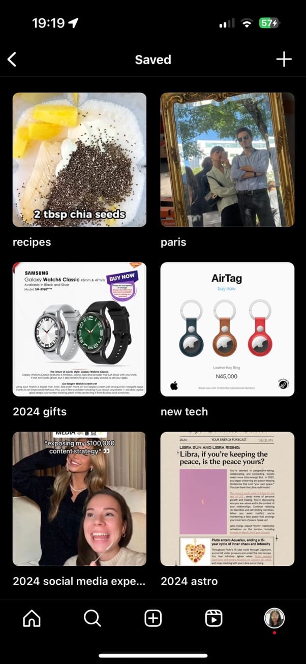 - Social media bookmark folders: Don’t overlook the built-in bookmarking features of social media platforms themselves. They can be a simple yet effective way to start your swipe file. I take advantage of X Premium’s ability to organize your Bookmarks into folders, and my Instagram Collections are a messy but cohesive swipe file for personal pursuits.
