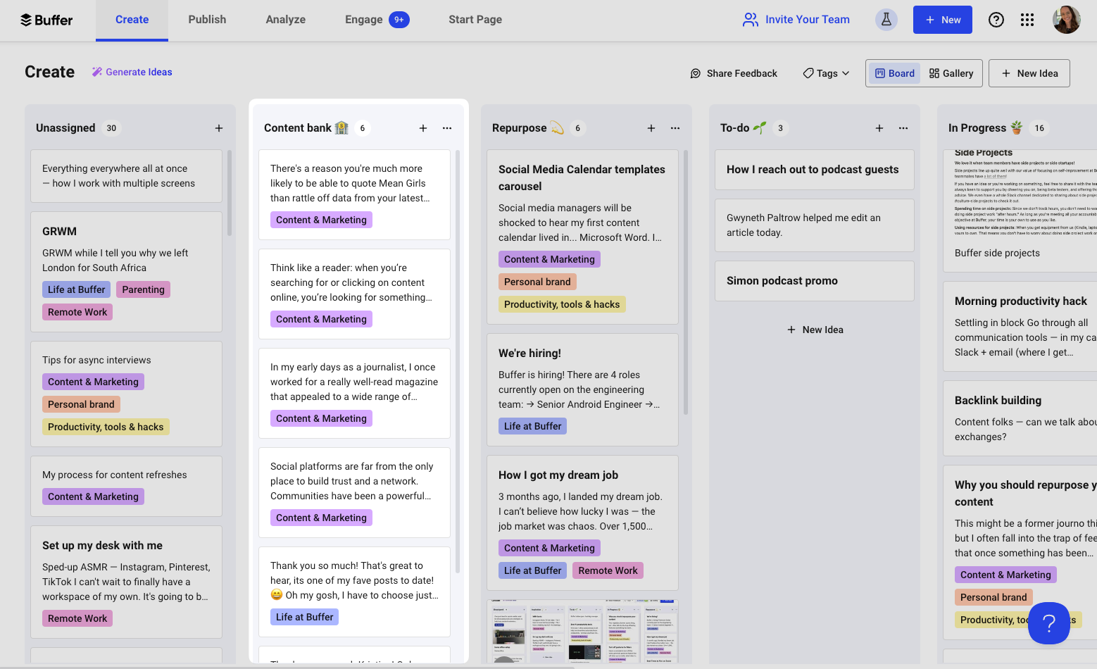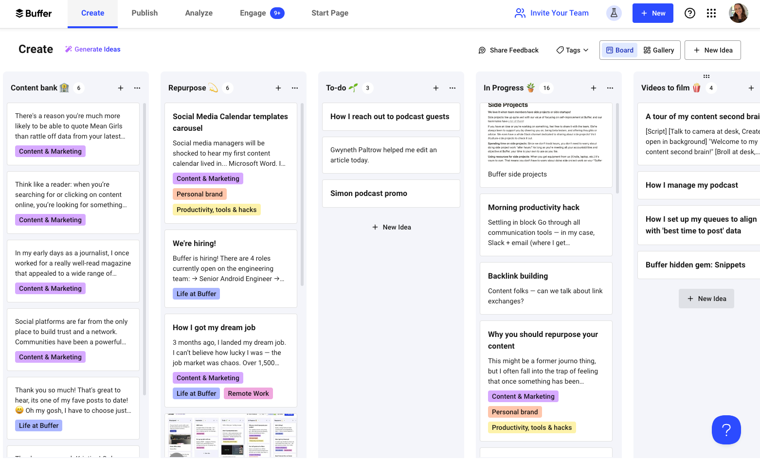 I’m definitely biased here, but my preferred tool for this habit is Buffer’s Create Space — it’s a flexible content library of sorts, where you can save your ideas as cards that can be organized in a bunch of different ways thanks to color-coded tags and a Kanban board view.