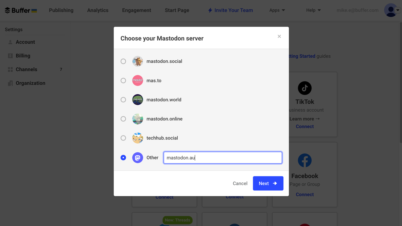After choosing to connect a Mastodon channel, you’ll be prompted to choose a server. Buffer automatically suggests some of the more popular servers, but if your profile is on a server not on the list, you can choose the “Other” option and manually type the server address.