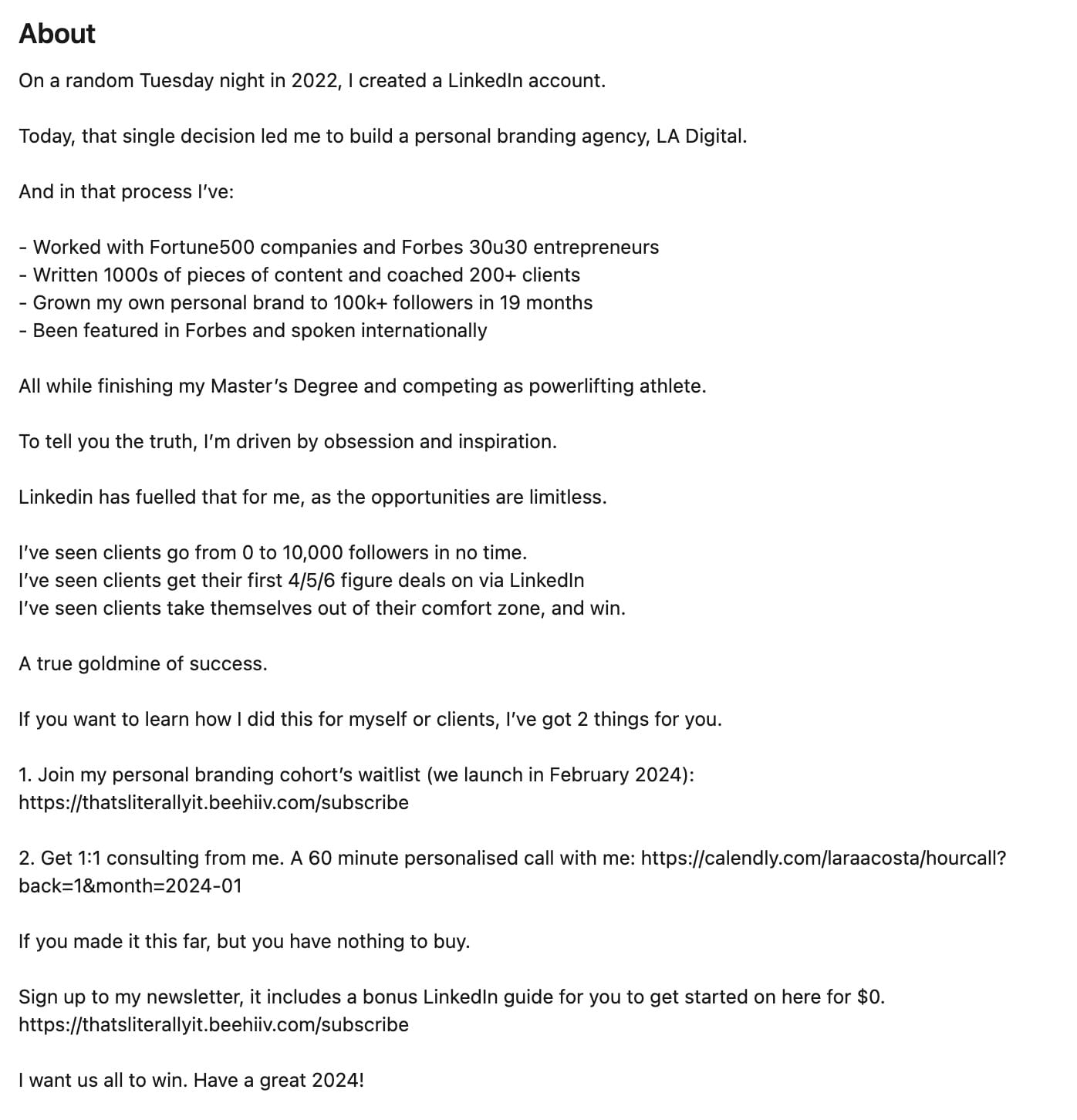- Write a helpful and detailed profile summary: Your profile summary is where you can share more about your experiences, expertise, and interests. It's also a space to share your personal or business vision. Use it to tell the story of your career journey and why someone should follow you or engage with your content. Feel free to also leave a call-to-action – an offer for a coffee chat is my preferred CTA.