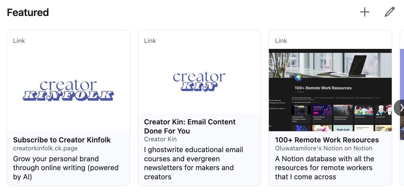 - Use the Featured section: The Featured section is a space to showcase your most popular and engaging content. This could include articles, videos, presentations, or any other content that highlights your expertise and value.