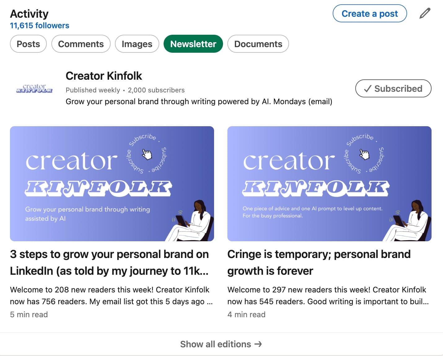 - Start a newsletter: Speaking of LinkedIn’s content types, there’s no better way to do LinkedIn content than to publish a newsletter. It will not only help you consistently publish high-quality content but can also help with discoverability by improving your SEO as search engines frequently pick up long-form LinkedIn articles.
