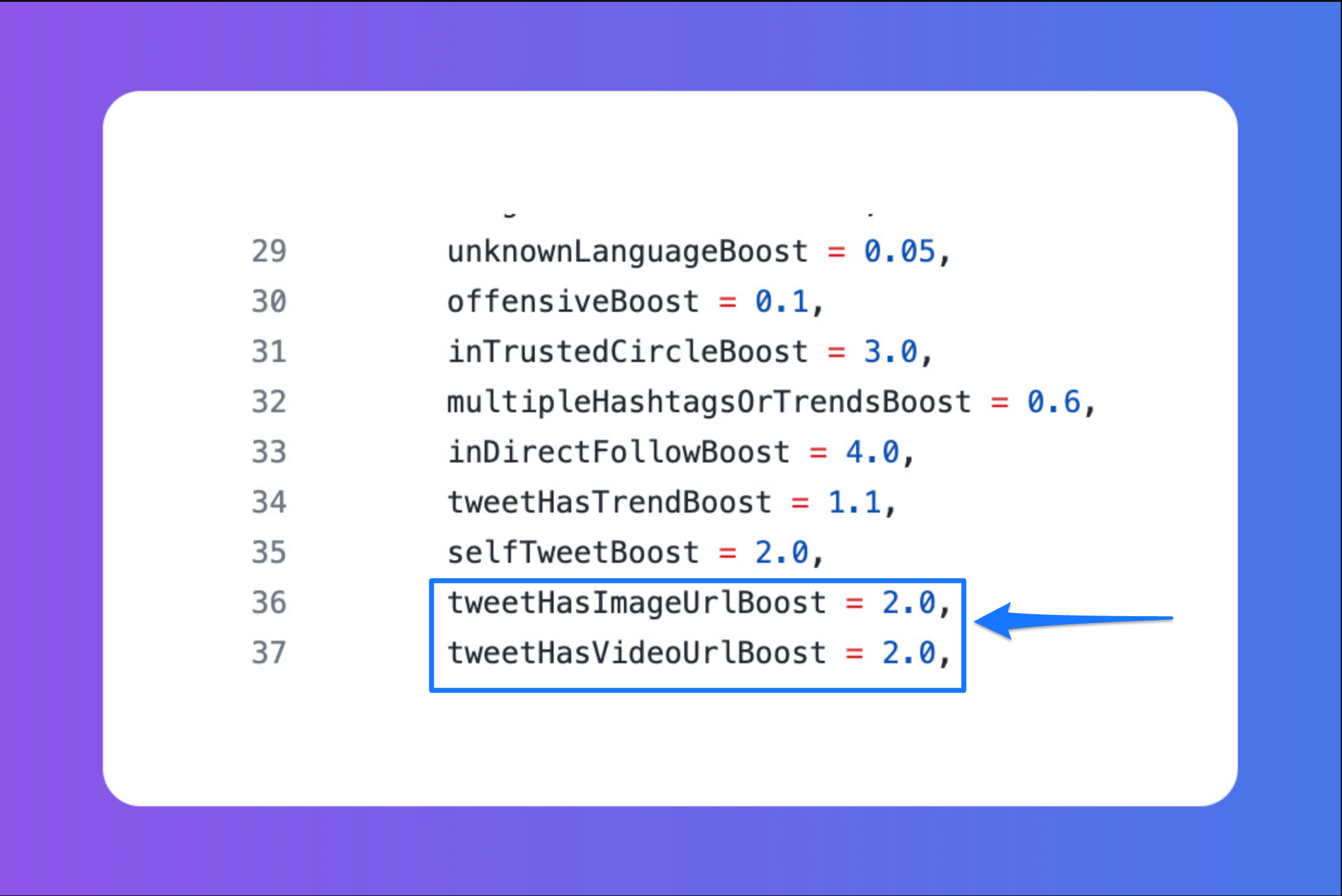 All social media platforms love images, videos, and GIFs, including Twitter. Tanay’s analysis of the open-source code found tweets with photos and videos receive twice the boost compared to the tweets without them.