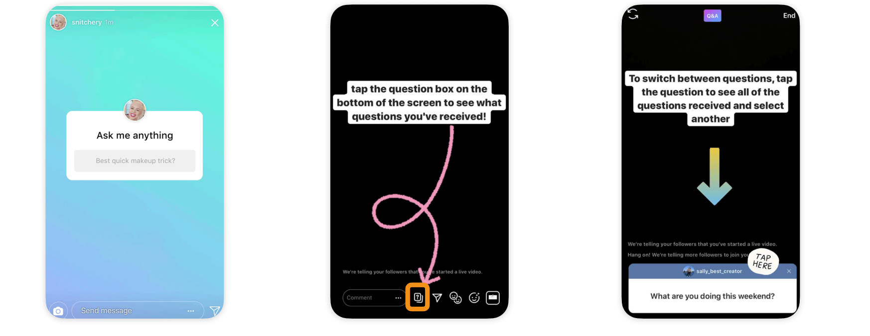 If you use the question stickers on Instagram Stories to let your audience ask questions, you can answer them on Instagram Live. There’s a question feature at the bottom of the screen when you’re live. Click on it to see a question from your audience pop up. To see other questions, simply tap on the question sticker.