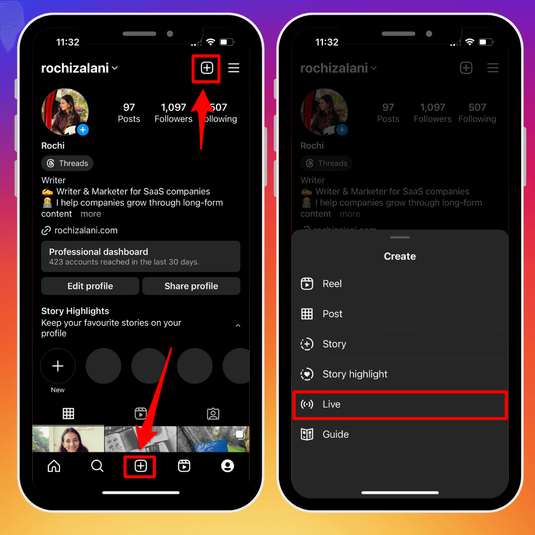 You’ll find the “+” icon on your Instagram profile and your Instagram Story. You can go live using any method.