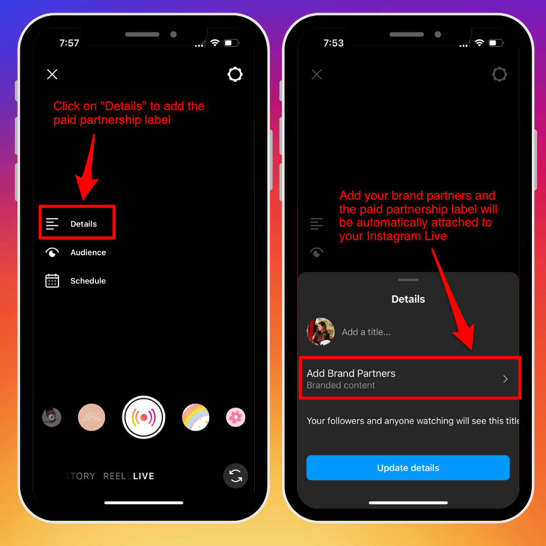 Instagram even lets you mark a live video with a paid partnership label to ensure you meet FTC guidelines. Ask your influencers to click on “Details” and they’ll find the option to add brand partners.