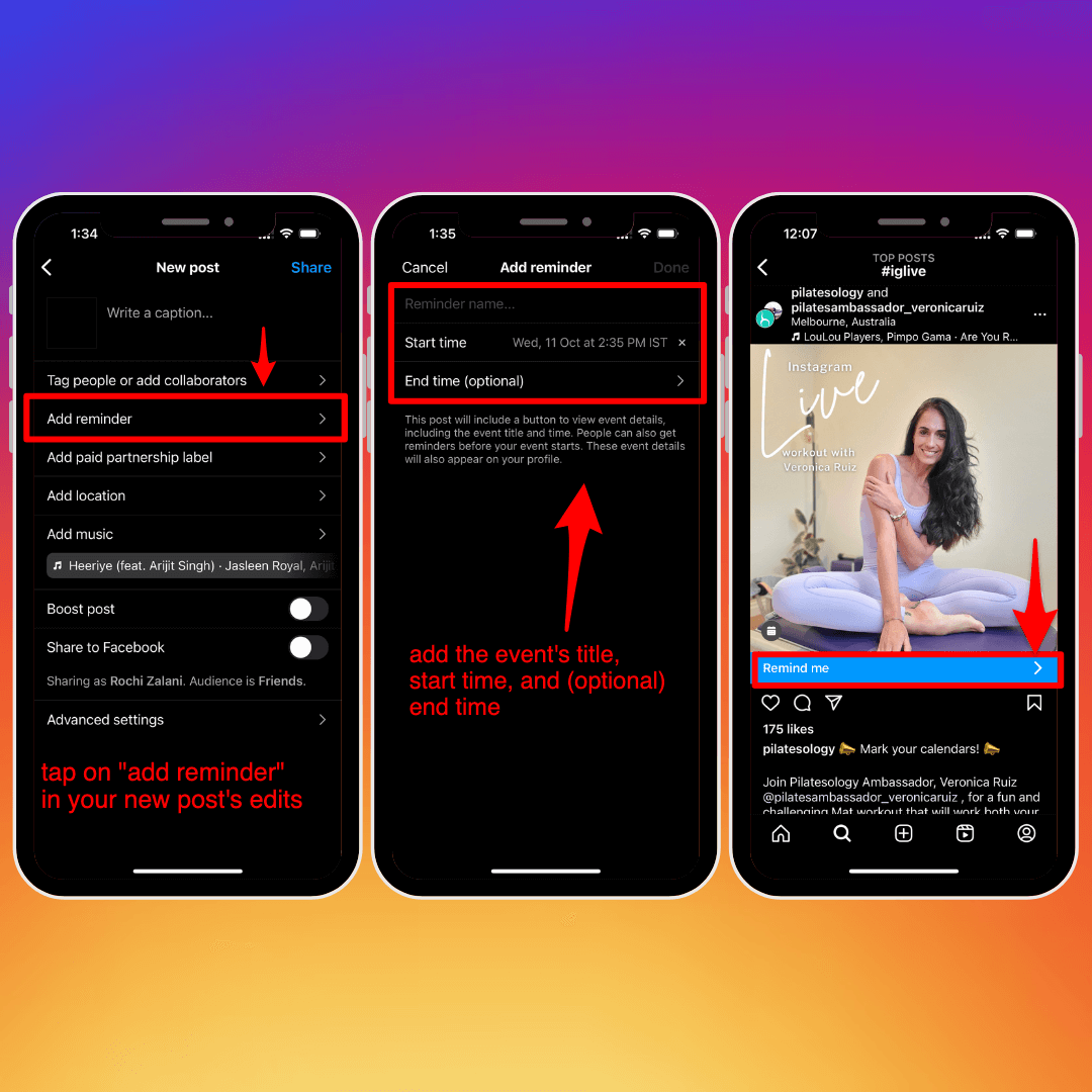 You can also deliver these reminders through your Instagram feed posts. When you create a post using the “+” icon, select “posts” and click “add reminder” — you can give the reminder a name and add the start time. Your audience can click on the “remind me” button to get reminded of the event (see the example of pilatesology’s post to show what it appears like). Optionally, you can also add an end time to tell your audience how long the event will be.