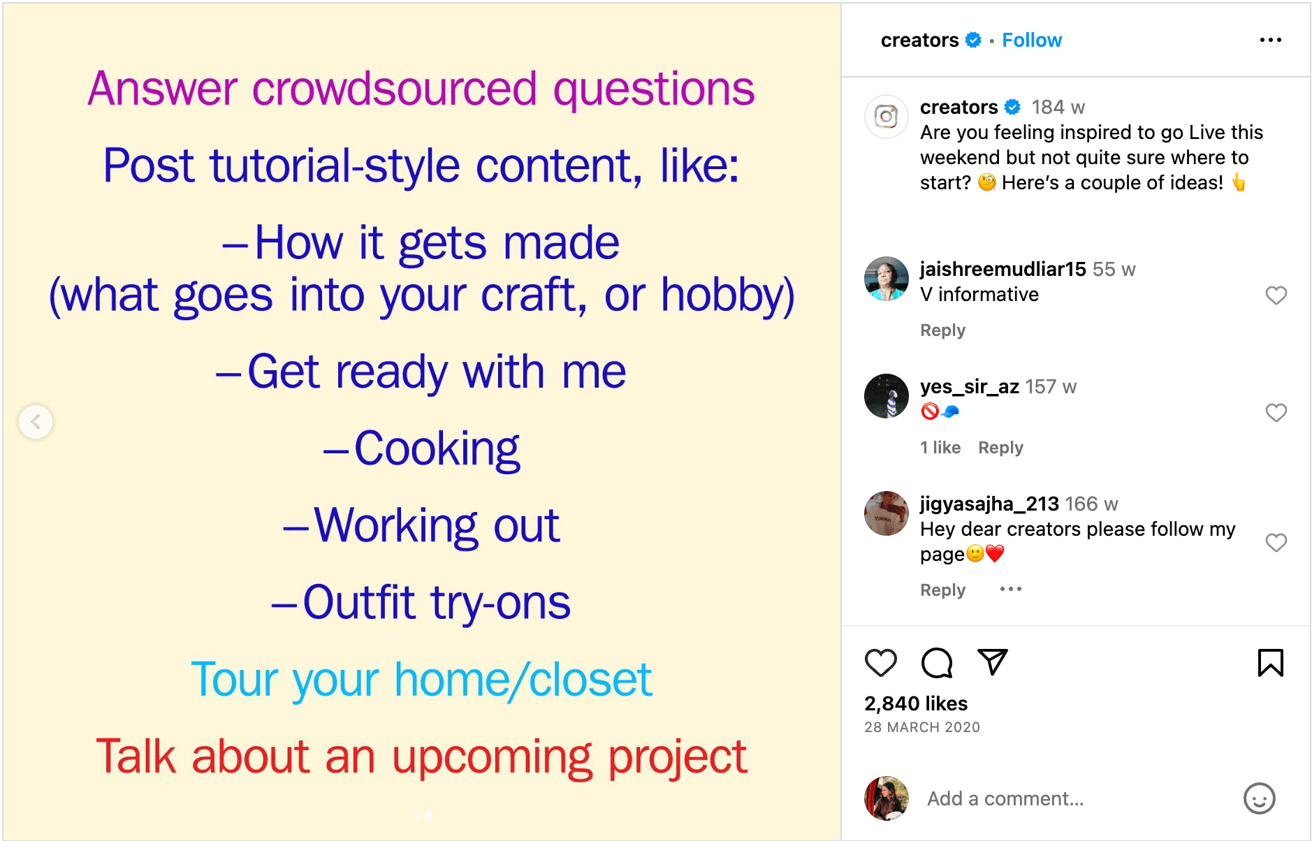 In both series, a creator joins an Instagram employee to share their tips and advice on a specific topic. Having a recurrent series makes your audience take notice and encourages you to show up regularly for an Instagram Live.