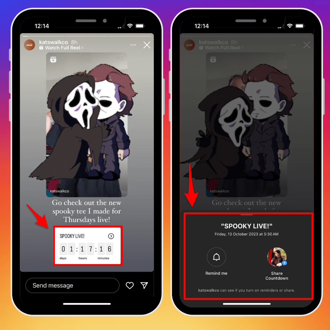 My favorite is the countdown sticker in Instagram Stories. Your audience can tap on the sticker to add a reminder to join your live stream and share it in their Stories. Katswalk Co hosts an Instagram live on Mondays and Thursdays and uses the countdown sticker to remind her followers to join her live stream.