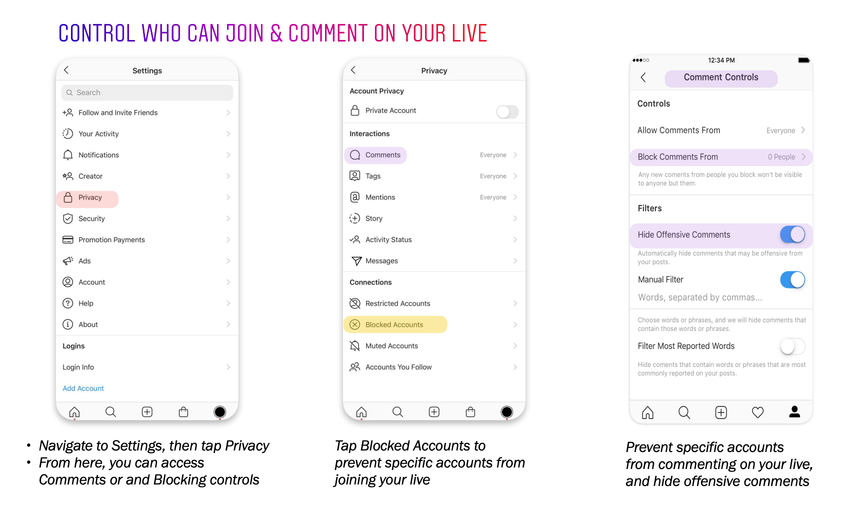 Unfortunately, trolls are present everywhere — including your Instagram Live. Go to your settings to access comment controls and automatically block comments from certain people and hide comments containing offensive words.