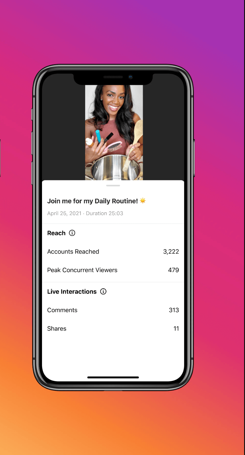 As soon as your live video ends, you can view your live video’s analytics — including accounts reached, peak concurrent viewers, comments, and shares.
